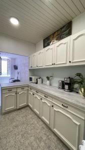Goście mają dostęp do w pełni wyposażonego aneksu kuchennego zawierającego piekarnik, płytę grzewczą, lodówkę, mikrofalówkę oraz czajnik elektryczny wraz z zestawem do parzenia kawy i herbaty oraz naczyniami kuchennymi niezbędnymi do przygotowania posiłków. Wyposażenie pokoju obejmuje ręczniki, pościel (na życzenie poduszki antyalergiczne), żelazko z suszarką na ubrania oraz miejsca do siedzenia wraz z rozkładaną sofą. Apartament ogrzewany jest i wyłożony kaflami lub marmurem dla łatwej konserwacji.