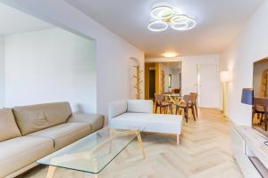 Inside the apartment you will find a separate bedroom with one bed alongside a living room featuring a sofa and flat-screen TV. The fully equipped kitchen boasts modern appliances including an oven, stovetop, refrigerator, dishwasher, microwave, coffee machine, electric kettle, toaster as well as all necessary kitchenware and a dining table. The bathroom comes complete with a shower, hairdryer and toiletries like shampoo and body soap. Extra amenities include heating facilities iron with ironing board wardrobe closet towels washing machine seating area bed linen air conditioning.
