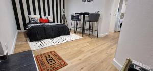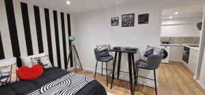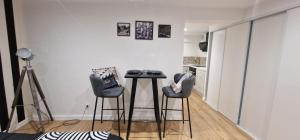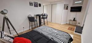 Le logement comprend une chambre équipée d’un lit ainsi que des équipements essentiels comme la climatisation, le chauffage et une machine à laver pour plus de confort. Une cuisine entièrement équipée permet aux hôtes de préparer leurs repas durant leur séjour tandis qu’une télévision à écran plat assure les moments de divertissement.