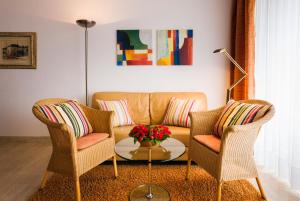 Внутри апартаментов имеется одна спальня с двумя кроватями и одна ванная комната с ванной или душем и феном для волос. Полностью оборудованная кухня включает духовку, плиту, холодильник, посудомоечную машину, кофеварку и весь необходимый кухонный инвентарь плюс принадлежности для приготовления чая и кофе. В числе дополнительных удобств — подушки из синтетических материалов без пера, постельное бельё и полотенца для комфортного пребывания, также есть стиральная машина и гладильные принадлежности с утюгом.