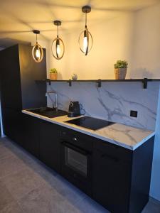 La cocina americana está completamente equipada e incluye utensilios junto con electrodomésticos modernos como placa vitrocerámica, horno, microondas, lavavajillas, frigorífico y cafetera. Además hay una mesa comedor para disfrutar las comidas dentro o en el comedor exterior en la terraza que también cuenta con muebles para exteriores desde donde se contemplan vistas emblemáticas al paisaje urbano, montañas, mar y piscinas.