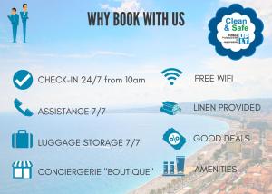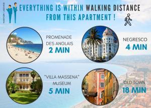 Apartmán je také výhodně situován 1,1 km od Ruské pravoslavné katedrály, 1,4 km od nádraží Nice-Ville a 1,6 km od Avenue Jean Medecin. Letiště Nice Côte d'Azur je vzdáleno jen 4 km, pro pohodlí hostů je zajištěna placená kyvadlová doprava na letiště.
