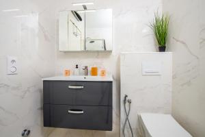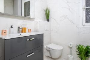 L’appartement comprend un lit ainsi qu’un coin cuisine entièrement équipé avec des appareils modernes : plaque de cuisson, réfrigérateur, lave-vaisselle, micro-ondes, grille-pain, machine à café et bouilloire électrique avec matériel pour préparer thé et café. Les équipements incluent aussi la climatisation, un lave-linge et une télévision écran plat dans le séjour. La salle de bains propose des articles de toilette offerts — savon corporel et shampooing — ainsi qu’une douche et une baignoire.